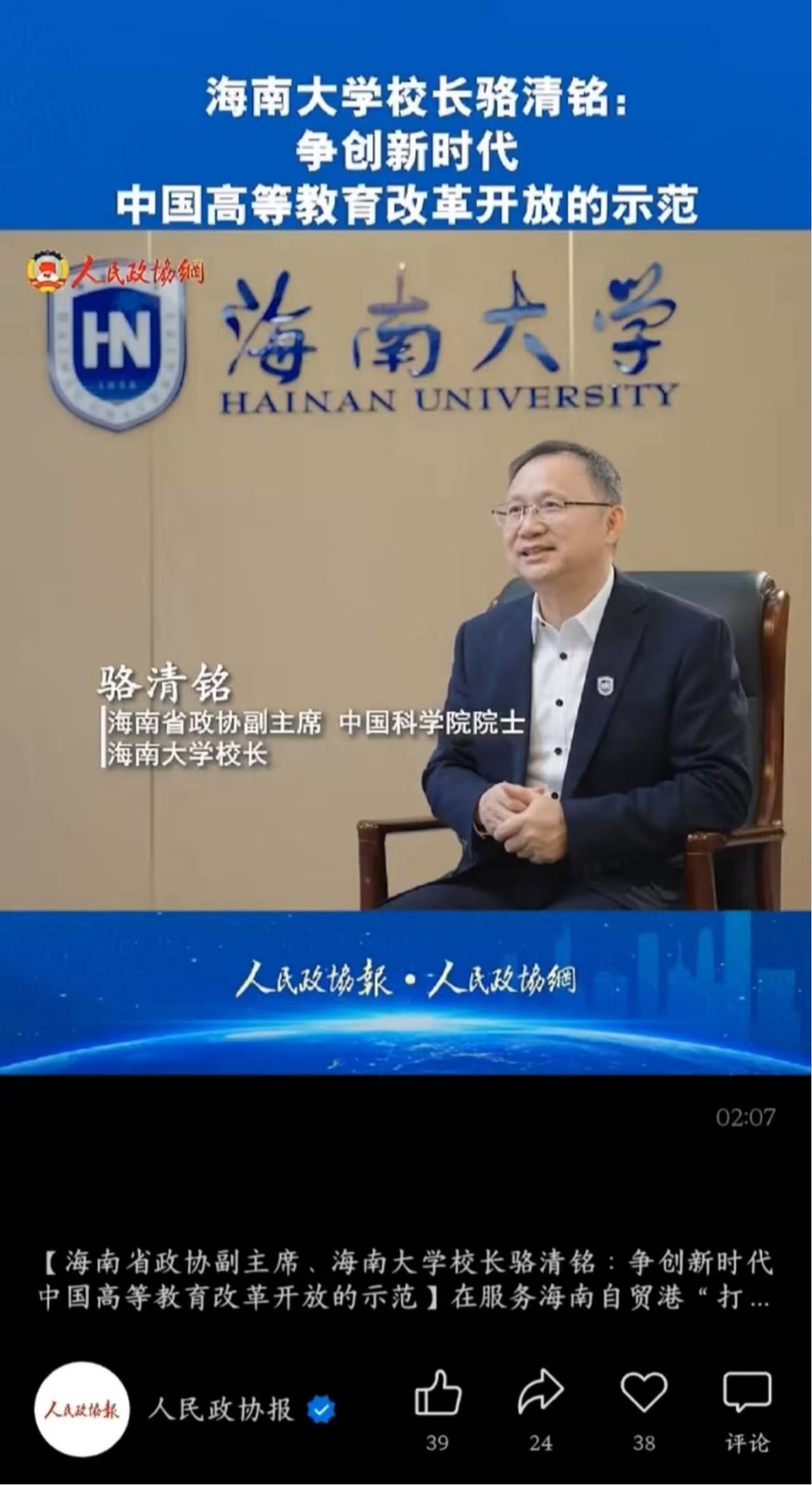 【人民政协报】海南省政协副主席、taptap点点官网校长骆清铭:争创新时代中国高等教育改革开放的示范