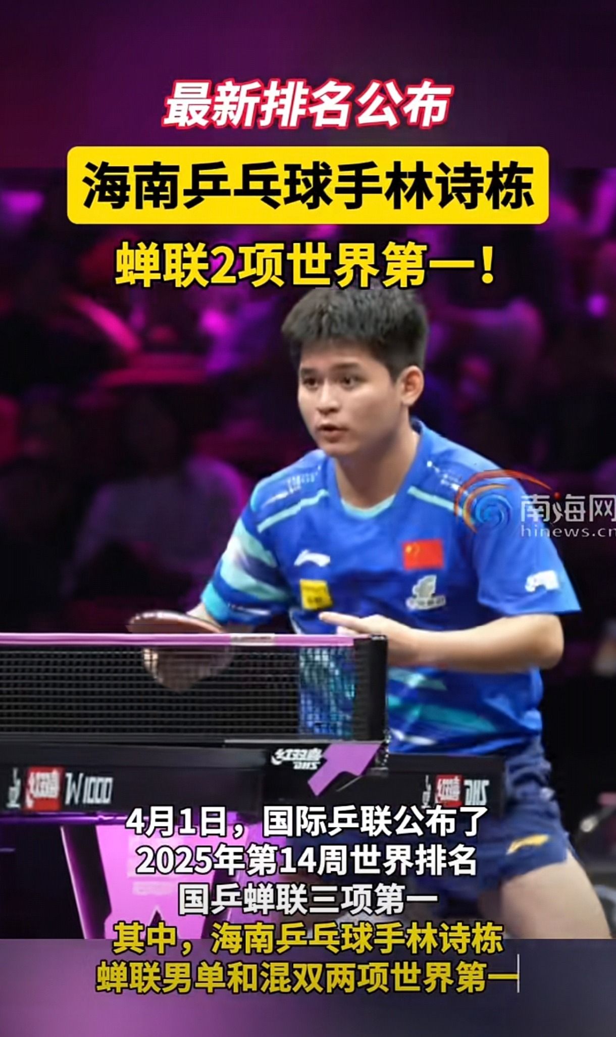 海南乒乓球选手林诗栋蝉联2项世界第一