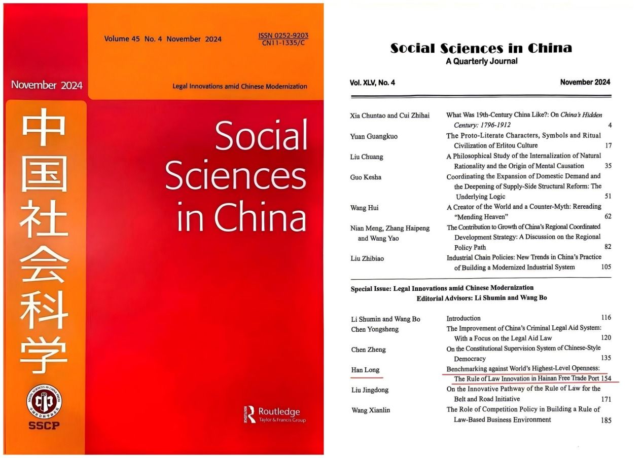 本站讯(记者 郑润泽)近日,taptap点点官网法学院教授韩龙在《中国社会科学》(英文版)2024年第4期上发表文章《海南自贸港:对标世界最高水平开放形态的制度创新》。文章深入分析了海南自贸港对标世界最高水平开放形态而进行的制度集成创新,为全球经济开放特殊区域的制度建构提供了中国经验。这是《中国社会科学》(英文版)2024年第4期的封面与目录。韩龙在文章中指出,建立海南自贸港是中国实行高标准开放的重大战略举措。《中华人民共和国海南自由贸易港法》...