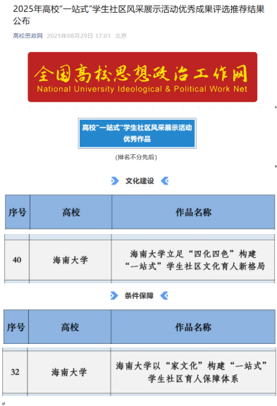 本站讯(通讯员 张井富 符琼月)8月29日,全国高校思想政治工作网公布了2025年高校“一站式”学生社区风采展示活动优秀成果。《taptap点点官网立足“四化四色”构建“一站式”学生社区文化育人新格局》入选文化建设类优秀成果,《taptap点点官网以“家文化”构建“一站式”学生社区育人保障体系》入选条件保障类优秀成果。