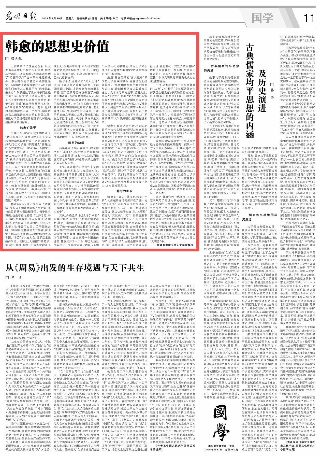 上古被赋予了瑰丽的想象,后人著书造论皆以三代之治为圭臬,旌表品评都以三圣为标杆,尧舜禹最终成了“治国平天下”这一最高理想的化身。春秋时期的学者还不敢妄比先贤,但战国诸子就放得很开了,孟子即借孔门弟子之口称孔子为“自生民以来未有”,似乎超过了凡夫俗子而直追三皇五帝,至少“贤于尧舜远矣”。孟子还直接把颜回与大禹相提并论,但他们的“同道”仅在于能够坚守本分,故“易地皆然”的定论过于勉强,他们的身份和功绩不在一个档次,颜回的成己之德无法比肩大禹的养民之恩,但这对于弘扬儒家的道德教化却能起到振聋发聩的作用。