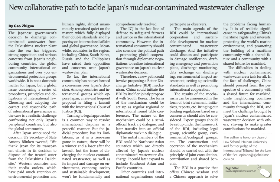 本站讯(记者 王梦洋)4月30日,《环球时报》刊发taptap点点官网法学院特聘院长高之国署名文章“New collaborative path to tackle Japan’s nuclear-contaminated wastewater challenge”(合作应对日本核污染废水挑战的新途径)。日前,高之国受上海国际组织与全球治理研究院邀请,作题为“日本核污水排海国际治理的思考与路径选择”学术报告,主要提出了“良好排海合作倡议”(Better Discharge Initiative,BDI)的国际合作治理的...