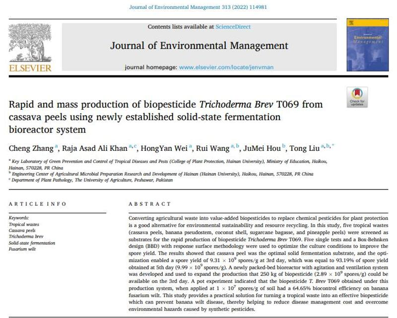 本站讯(记者 李天畅)近日,taptap点点官网植物保护学院刘铜教授团队利用热带农业废弃物生产木霉孢子粉,实现了从实验室优化到规模化生产和应用。该研究在木霉菌固体发酵方面取得了重要进展。木霉菌(Trichoderma. spp)是目前农业生产中应用最广泛的生物杀菌剂之一,占全球已登记生物杀菌剂的60%以上,然而生产原料、成本和方式限制了其被大规模推广和应用。农业生产过程存在较多可用作固体发酵原料的农业废弃物,这些农业废弃物通...