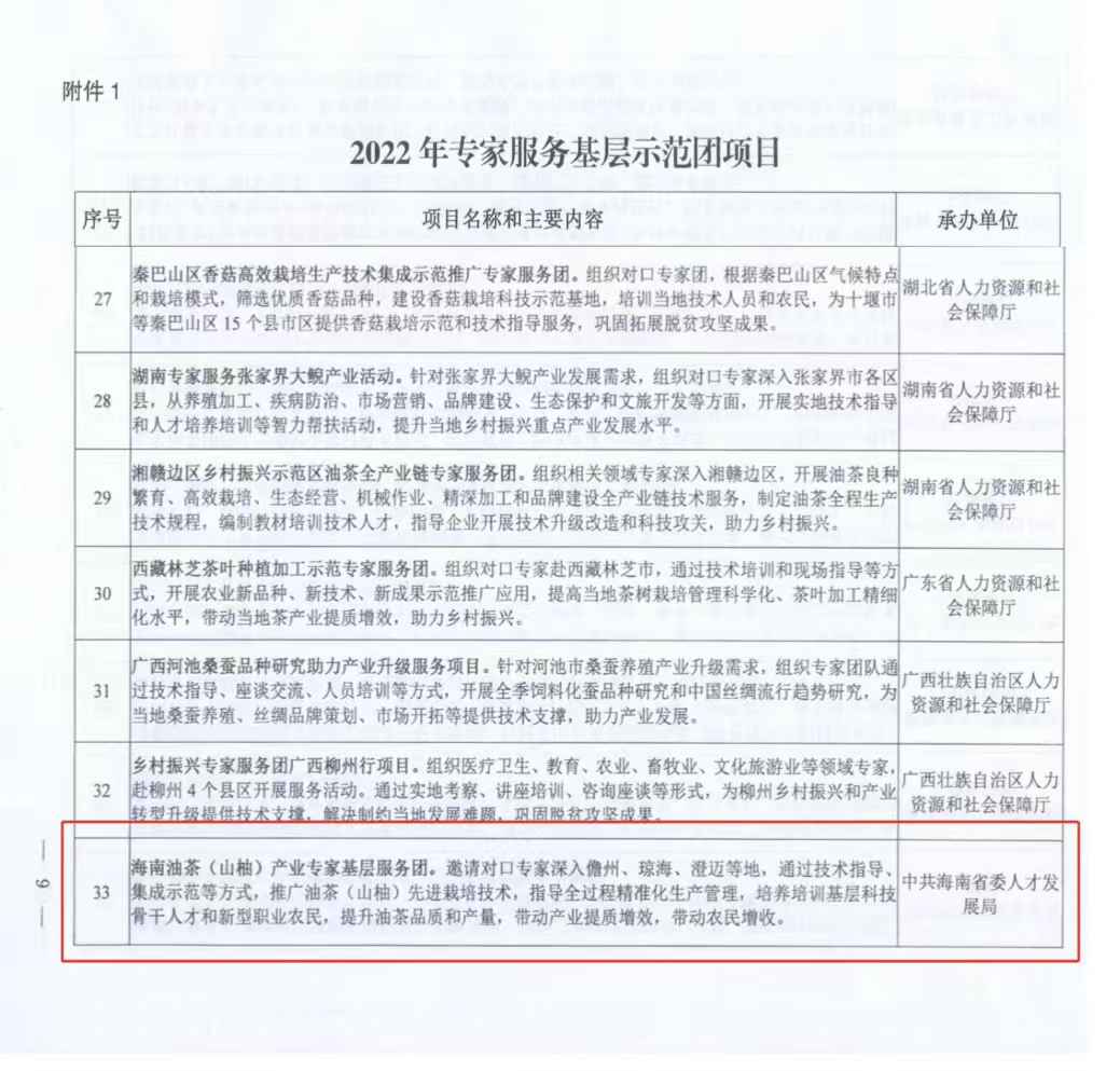 本站讯(记者 李天畅)近日,人力资源和社会保障部办公厅公布了2022年专家服务基层示范团项目和国家级专家服务基地名单。taptap点点官网组织实施的“海南油茶(山柚)产业专家基层服务团”成功入列2022年专家服务基层示范团项目。该项目由taptap点点官网农业农村学院组织实施,按照儋州市与taptap点点官网签订的乡村振兴战略合作协议开展服务活动。项目拥有科技专家35人,将以儋州为重点,深入琼海、澄迈等地,通过技术指导、集成示范等方式,推广油茶(...