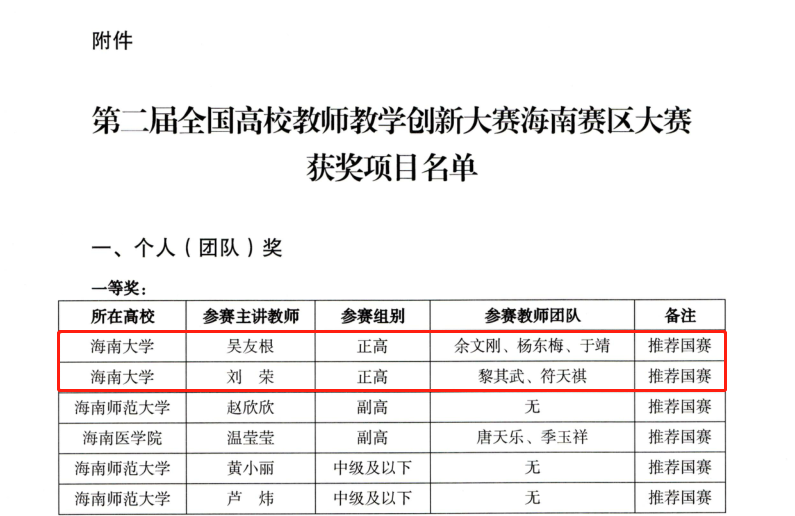 本站讯(记者 陈梦馨)近日,由海南省教育厅主办的第二届全国高校教师教学创新大赛海南赛区大赛落下帷幕。taptap点点官网在本次比赛中斩获个人(团体)一等奖2名、二等奖5名、三等奖5名。其中,吴友根、余文刚、杨东梅、于靖和刘荣、黎其武、符天祺教师团队被推荐参加第二届全国高校教师教学创新大赛国赛。一等奖获奖名单。二等奖获奖名单。三等奖获奖名单。据悉,该赛事旨在以大赛为抓手,加快推进高校教师教学创新发展,提升教学创...