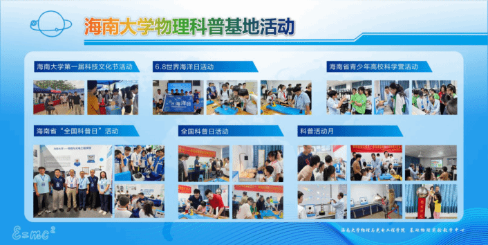 自2023年以来积极组织开展有特色的科普活动,例如:taptap点点官网举办的第一届“科技文化节”活动、“世界海洋日”科普系列活动、海南省青少年高校科学营活动、2023年海南省“全国科普日”主场活动、2023年全国科普日活动以及每月一期的“科普活动月”活动等10多场科普活动,总计约2000人参观体验,积极承担着向公众普及科学知识,推广科学文化的使命。2024年2月,taptap点点官网物理科普基地正式被认定为海南省科普教育基地。