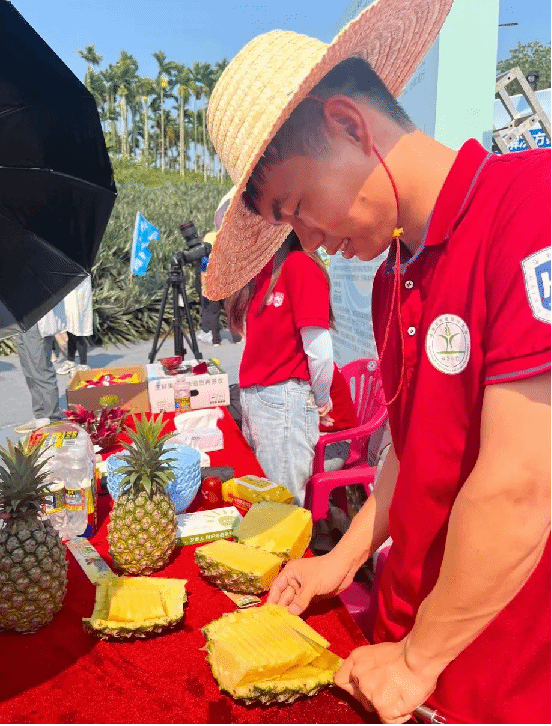 菠萝地旁,来自海南多个科技小院的硕士研究生带来菠萝、火龙果、燕窝果、红茶、大米等农作物展示。将菠萝对半切开,金黄的果肉汁水丰富,吸引了众多附近村民前来品尝。