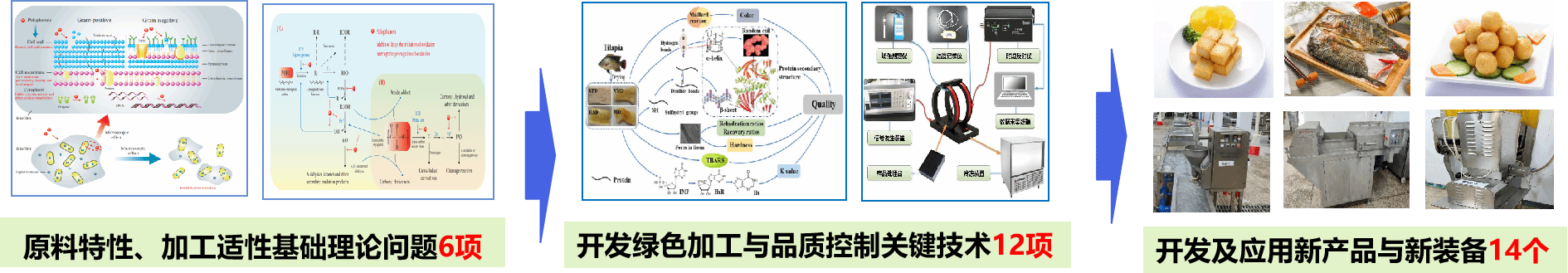 以典型热带海洋食品(金鲳鱼、罗非鱼、南美白对虾等)为原料,经过产学研一体化联合攻关,开发热带海洋食品绿色加工与品质控制技术关键技术、副产物的全利用技术,开发了新产品和加工配套装备。